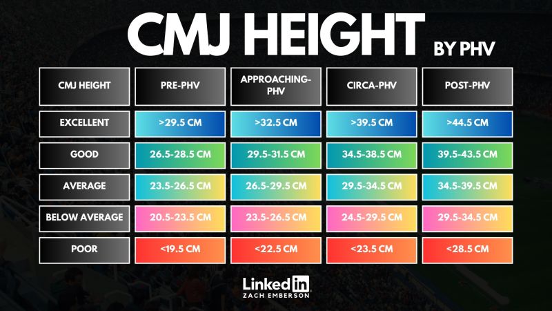 While these normative data are suggested guidelines and should be interpreted with care, they offer valuable CMJ norms for youth athletes categorised by their stages: pre-peak height velocity, approaching peak height velocity, circa-peak height velocity, and post-peak height velocity.